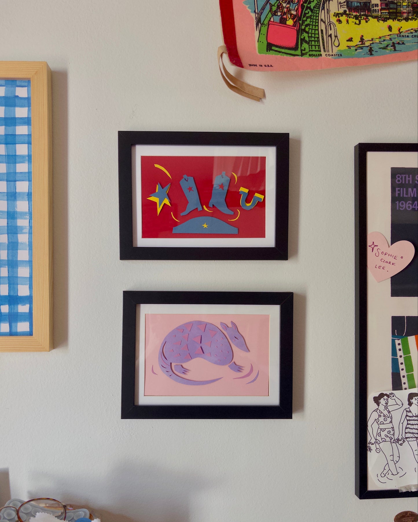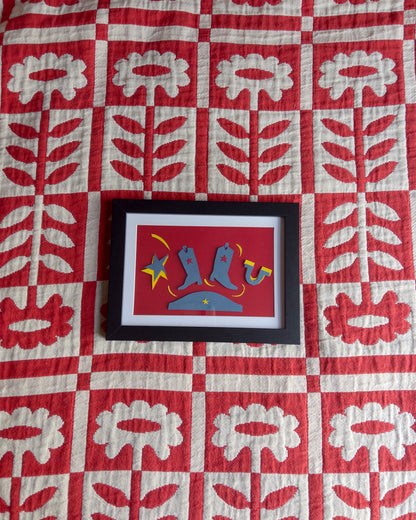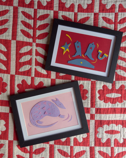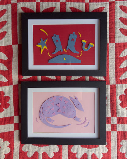 These dancing cowboy boots are delicately hand cut with a slight three-dimensional element. Take them home with or without their armadillo friend!